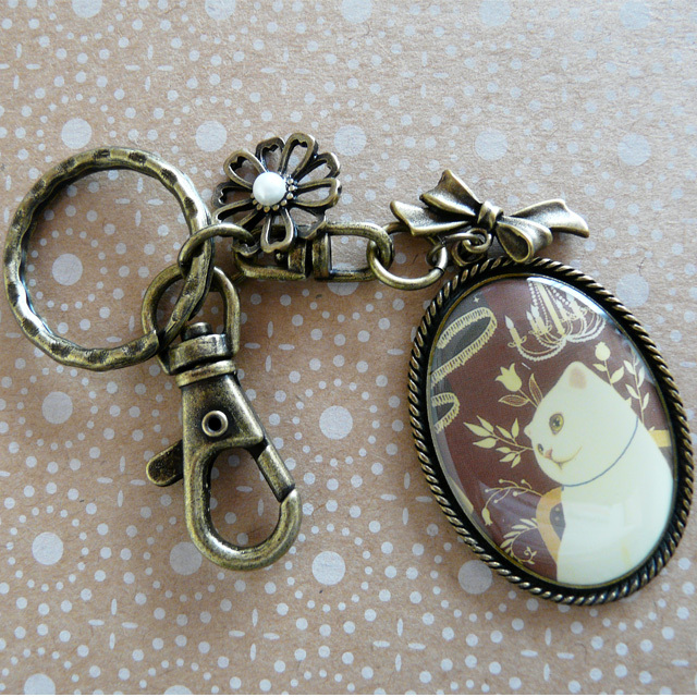 金古美カラーのアンティーク調金具を使った、白猫のキーホルダーです。